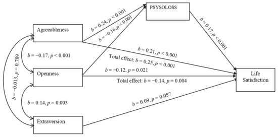 The second path analysis (Table 4 and Figure 2) was conducted to assess the mediation of PSYSOLOSS in the relationship between personality and life satisfaction. The results illustrate (Table 5) that openness and agreeableness had a significant total effect on life satisfaction (β = −0.14, p = 0.004 and β = 0.25, p < 0.001, respectively). These associations were partially mediated by PSYSOLOSS. Individually, PSYSOLOSS mediated the relationship between agreeableness and life satisfaction (β = 0.04, p < 0.001), as well as the association between openness and life satisfaction (β = −0.03, p = 0.001). In addition, life satisfaction significantly and directly correlated to agreeableness (β = 0.21, p < 0.001) and openness to experience (β = −0.12, p = 0.02).