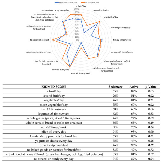 Compliance with items from the KIDMED test in active and sedentary adolescents. The radar chart plots the values of each item of the Mediterranean diet score along a separate axis that starts in the center of the chart (0% compliance) and ends at the outer ring (100% compliance). In the table the statistical differences of each item of the Mediterranean diet score between active and sedentary adolescents were evaluated by chi-squared tests.