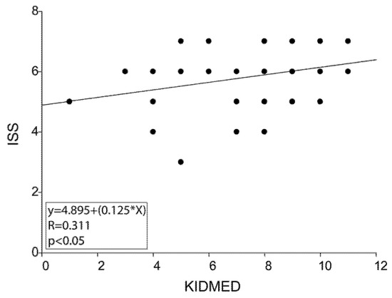 Next, in multiple linear regression we analyzed the KIDMED score as well as lifestyle habits in relation to ISS score using age and sex as independent variables in the total sample. Interestingly, we observed that the KIDMED score can be predicted from a linear combination of the ISS score (β = 0.375, p < 0.001), age (β = 0.140 p = 0.170), and sex (β = 0.076 p = 0.454) (Table 2). Similarly, lifestyle can be predicted from a linear combination of the ISS score (β = 0.432, p < 0.001), age (β = −0.087 p = 0.373), and sex (β = 0.0463 p = 0.642) (Table 2). These data suggest a direct relationship between ISS and both KIDMED and lifestyle, independent of age and sex.