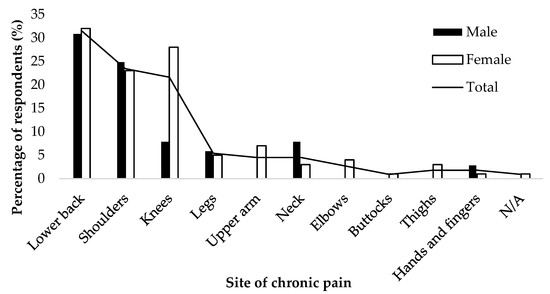 In this study, females presented with lower back and knee pain. In comparison, many males presented with shoulder and lower back pain. Previous studies have compared chronic pain measurements, such as the number of pain sites, with overall pain severity in relation to lower limb function (such as hip and knees) in the elderly [33,34,35]. These studies showed that there was an association between chronic pain and daytime activity in elderly people. Fethke reported that disabilities resulting from manual labor had different physical symptoms depending on the characteristics of the work [36]. In this study, the majority of the males engaged in farm work as a daytime activity, and common sites of pain were the shoulders and neck. This study was undertaken in a rural area where agricultural products, such as peaches and grapes, are actively cultivated. Therefore, ADL may be affected due to chronic pain in the shoulders and neck that results from overuse of the upper extremities while performing overhand farm work [37,38].