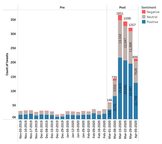 From a sample of tweets obtained between November 2019 and April 2020, there was a total of 192,430 tweets related to telehealth and telemedicine. Prior to the COVID-19 outbreak in November 2019, there was a relatively small and stable baseline of telehealth or telemedicine-related tweets. In the initial 4-month period sampled here, there were on average approximately 2700 telehealth-related tweets per week, with slight decreases to 2000 per week in activity during the Thanksgiving and Christmas holidays in 2019. This was followed by a rapid escalation of activity, reaching a peak of 35,625 tweets during the week of 15 March 2020—a nearly 13-fold increase (Figure 1). Given the stable, low baseline activity during the first 4 months, we defined a cutoff point as the week in which total tweets were greater than 1.5 times during the previous 4-week average, which was the week of 1 March 2020; therefore, as shown in Figure 1, pre is 3 November 2019 through 28 February 2020, and post is from 1 March through 5 April 2020. Throughout the entire period, there were no significant differences in sentiment of positive to neutral to negative from week to week.