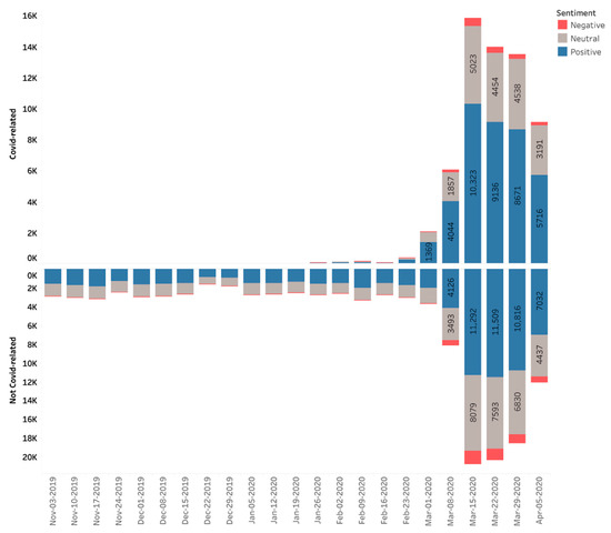 Prior to the pandemic entering Europe or the United States regions, few of the telehealth or telemedicine-related tweets referred to COVID-19 (Figure 2). Once COVID-19 became more salient due to increased awareness, COVID-19 related tweets began to increase dramatically, especially after 1 March 2020. Even as overall telehealth and telemedicine-related tweets increased, the division between COVID-19 and non-COVID-19 related tweets was roughly symmetrical, with no obvious differences in sentiment, which remained overwhelmingly positive or neutral for both categories.