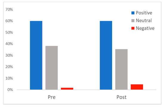 Given that consumers as the end-users are the ones most likely to benefit from telehealth and telemedicine, we examined user sentiment from consumers only. Although overall sentiment in telehealth-related tweets across all users was overwhelmingly positive, it would seem unlikely that, for example, vendors would express a negative sentiment on a social media platform [15]. As Figure 3 shows, consumers showed mostly positive (60.0%) or neutral (38.2%) sentiment before 1 March 2020 (pre-), and this was essentially the same post-, with 59.9% positive and 35.5% neutral. There was a slight shift from neutral to negative, with negative sentiment in telehealth-related tweets among consumers increasing from 1.8% pre- to 4.6% post-.