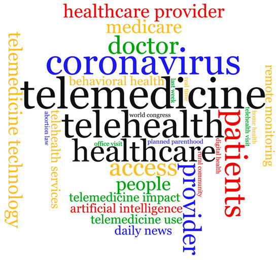 We further analyzed the text of the 192,430 tweets for the most used bigrams and unigrams (single words) and displayed them in a word cloud visualization (Figure 4). Bigrams are pairs of adjacent words that may or may not be grammatically correct or have semantic meaning [16]. The top five unigrams by frequency from 1 to 5 were telemedicine, telehealth, coronavirus, healthcare, and patients; while the top five bigrams were telemedicine technology, telehealth services, behavioral health, healthcare provider, and remote monitoring.