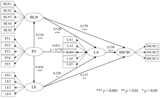 (5) LA had a significant effect on SSCSC (LA→SSCSC: β = 0.558, p < 0.001), which supports H8.