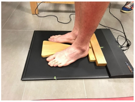The participants had to stand barefoot on the baropodometric platform and with their feet at a 15-degree angle from the sagittal plane and heels separated by 2 cm. To ensure the initial standardization of this position, we have designed and used a wooden spacer, which was removed once the position was achieved (Figure 1). Measurements were made first in the open eyes condition (OE) and then closed eyes (OC) for 90 s to evaluate postural control with and without visual input. The measurement conditions were reproduced exactly for each group (soccer players and control group).