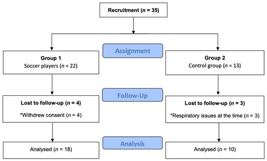 Of the 35 subjects initially recruited (22 soccer players, 13 non-athletes), 4 players finally decided not to participate, and 3 non-athletes had respiratory issues (suffered from common cold) at the time of the evaluation. Figure 2 describes the recruitment process of the participants.