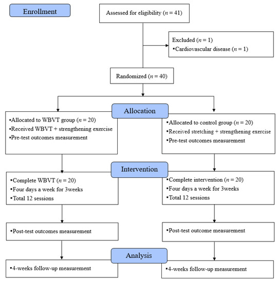 Forty participants, 20 in the control group and 20 in the WBVT group, were recruited between 09 April 2019 and 04 October 2019. Twenty participants were randomly allocated to each group. All participants completed the treatment and evaluation (baseline, post-treatment and 4-week follow-up evaluation) (Figure 2).