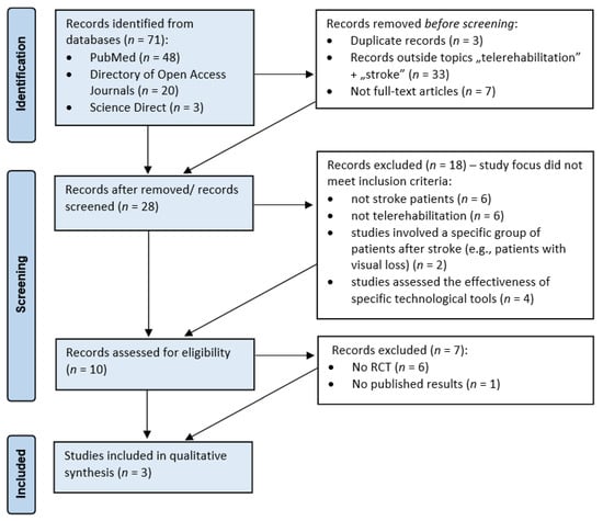 The review was based on research material obtained from PubMed, Directory of Open Access Journals, and Science Direct databases. The multi-search engine of the Main Library of the Medical University of Gdańsk was used to search for publications (search term: “telerehabilitation after stroke”). Study dates ranged from 2019 to 2021. Seventy-one records (PubMed—48, Directory of Open Access Journals—20, Science Direct—3) were identified and narrowed to the topics of “telerehabilitation” + “stroke”. The results were restricted to full text only. After removing duplicates, the authors independently analysed the titles and abstracts of 28 papers. Ten publications were selected, evaluating the effectiveness of teletherapy with respect to various aspects of the functional status: motor skills of the directly involved upper limb, balance, cardiorespiratory fitness, cognitive function, and the level of acceptance and feasibility of teletherapy by its users at home. The selection was based on inclusion criteria: (1) study involving post-stroke patients, (2) describing therapeutic interventions using telerehabilitation, (3) determining the effect of teletherapy on the functional condition of post-stroke patients, (4) evaluating the effectiveness of teletherapy in relation to conventional rehabilitation, (5) written in English. The review was conducted in accordance with the PRISMA statement. (Figure 1) [11]. The question generated using the Population, Intervention, Comparison, Outcomes, Study Design (PICOS) components was: “In post-stroke patients (P), is teletherapy (I) an effective rehabilitation tool for improving the functional condition (O) in reference to inpatient rehabilitation (C)?” Only randomised controlled trials (RCT) were included in the qualitative synthesis because they are considered as the best research design for evaluating the effectiveness of clinical interventions (S) [12].