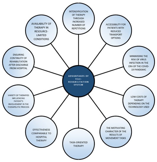 Of the 15 million people worldwide who suffer a stroke each year, 5 million are permanently disabled and require ongoing care [1]. It is important to ensure access to rehabilitation within the first 3 months after stroke, as up to 80% of hospital readmissions are related to health habits and lack of appropriate therapy and post-stroke care [2]. Patients are generally discharged from hospital rehabilitation units 8–10 weeks after a stroke incident [3]. The functional condition of patients is characterised by significant motor deficits, and they require assistance with basic daily living activities (e.g., toilet use or eating) [4]. This is a period of increased post-damage (compensatory) plasticity in which major reorganizational changes occur in the brain. Therefore, it is critical to provide intensive, continuous, highly repetitive, task-oriented therapy to patients during this time. However, the reduction in the availability of inpatient post-stroke rehabilitation due to the SARS-CoV-2 virus pandemic has many serious consequences [5]. Above all, it puts patients at risk of acquiring pathological motor patterns and exacerbation of disability. Dhand’s research shows that social isolation, which negatively affects the functional and emotional state of post-stroke patients, is an individual risk factor for stroke recurrence [6]. However, this single report should not be valid with respect to the entire population of stroke survivors. A potential solution to the problem of the increasing demand for rehabilitation services in resource-limited conditions is a teletherapy system, which involves the provision of rehabilitation services at home without direct contact between the therapist and the patient through communication technologies (mainly auditory, visual, tactile) [7,8]. Contact with the physiotherapist can be synchronous (communication with the therapist occurs over video chats during actual therapy time) or asynchronous (communication with the therapist occurs occasionally, outside of therapy time). Physiotherapists verify the progress, validate the correctness of motor tasks, and update therapy plans based on video conferencing feedback, system usage data, and game scores. The telerehabilitation system also uses virtual-reality-based therapy, which uses computer software to track users’ movements and allows them to interact with a game or scenario presented on a television screen [9,10].