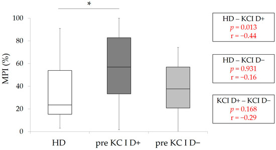 MPI in HD (control group), pre-MPI in KC I D+ and D−. * p < 0.05, Kruskal–Wallis with multiple comparison, r: effect size.