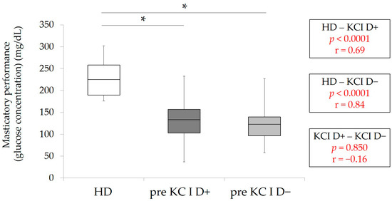 Masticatory function in HD (control group), pre-masticatory function in KC I D+ and D−. * p < 0.001, Kruskal Wallis with multiple comparison, r: effect size.