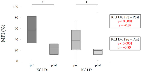 Pre- and post-MPI in in KC I D+ and D−. The statistical analyses were conducted between pre- and post-values in KC I D+ and D−, respectively * p < 0.05, Wilcoxon signed-rank test, r: effect size.