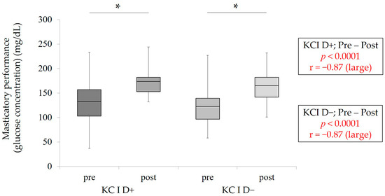 Pre- and post-masticatory function in KC I D+ and D−. The statistical analyses were conducted between pre- and post-values in KC I D+ and D−, respectively * p < 0.05, Wilcoxon signed-rank test, r: effect size.