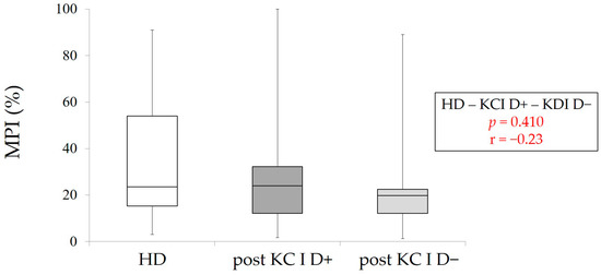 MPI in HD (control group), post-MPI in KC I D+ and D−. p > 0.05, Kruskal–Wallis with multiple comparison, r: effect size.