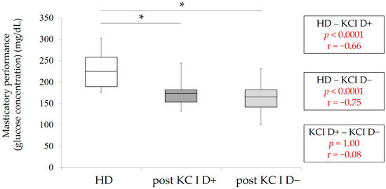 - Comparison of masticatory performance among HD, KC I D+, and D− with RPD (after RPD treatment: post-masticatory performance): difference in post-masticatory performance among HD-masticatory performance, post-masticatory performance in KC I D+, and KC I D− (Kruskal–Wallis with multiple comparison)