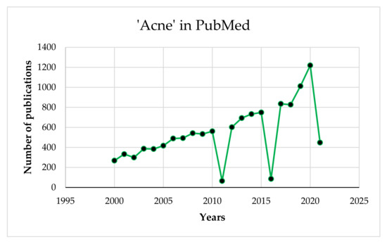 PubMed search results for ‘acne’ from 2000 to 2021.