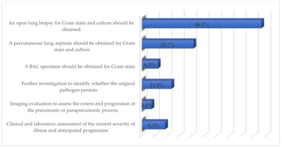 Restricting exposure to the antibiotic as much as possible (n = 71; 29.9%), improving antibiotic prescribing (n = 59; 24.8%), and using the appropriate dose of antimicrobials (n = 29; 12.2%) were considered the major factors by the respondents to reduce antimicrobials resistance (Figure 1). The majority of respondents (48.1%) opined that an open lung biopsy should be conducted for Gram-stain and culture in a child not showing any improvement within 48–72 h of treatment (Figure 2). More than 90% stated that all children and adolescents should be vaccinated once a year for the influenza virus to prevent the development of pediatric CAP.