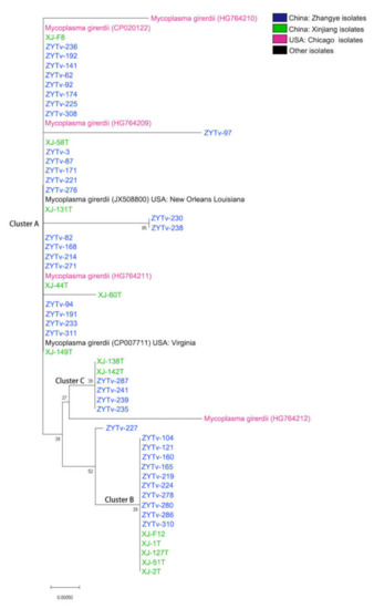 In this study, we obtained 48 Ca. M. girerdii 16S rDNA gene sequences. In total, 59 Ca. M. girerdii 16S rDNA gene sequences were used to generate a phylogenetic tree (Figure 1). The Ca. M. girerdii gene sequences included those from 39 Zhangye isolates and 13 Xinjiang isolates. The same gene sequence of seven isolates obtained from different sources could be divided into three clusters: A, B, and C. The Zhangye Ca. M. girerdii isolates are most closely associated with all genes that have been reported with similar genetic distances among isolates from Xinjiang (Figure 1). The Zhangye Ca. M. girerdii 16S rDNA gene sequences were submitted to the Genebank database (access number: LC554417 to LC554421).