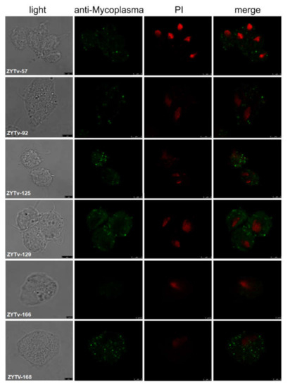 In this study, six Tv isolates were successfully cultured. In addition, Mycoplasma symbiosis was detected by PCR (primers in Table 1) in these isolates at first and at every month for 6 months of continuous culture. One isolate, ZYTv-92, had both M. hominis and Ca. M. girerdii symbiosis. The classifications of Mycoplasma symbiosis for six isolates are listed in Table 4. The cellular localization of M. hominis in the trophozoites of Tv after 6 months of continuous culture was evaluated, and the results suggested that the clinical samples ZYTv-57, ZYTv-92, ZYTv-125, ZYTv-129, and ZYTv-168 exhibited M. hominis symbiosis (Figure 2).