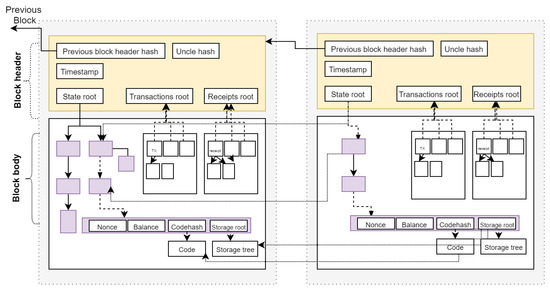 Ethereum is a stateful blockchain-based computing platform with smart contract functionality that lets users build decentralized applications running on blockchain technology. In addition to the distributed ledger, Ethereum provides a virtual machine, called the Ethereum Virtual Machine (EVM), which can execute scripts written in a high-level programming language (e.g., Solidity). In Ethereum, the blockchain data structure is more complex than in its predecessor, Bitcoin. The block’s header comprises metadata, and its body comprises multiple types of data, namely, transactions, receipts, and system states (account states). Each of these data types is organized into a Merkle tree or a Patricia tree (Radix tree) in the state tree. The state tree (or the account storage tree) is an essential component in the Ethereum ledger. It is used to implement the account model, whereby each account is linked to its related states (account balances, smart contract states, etc.). Any node can parse the tree using the account address and get the updated state without any overhead calculation. The state tree grows each time a change occurs in a state. It grows by adding new nodes (stored in the new block)—holding new states—which points to the nodes (stored in the previous block) containing the old value for the same state (Figure 1). To enforce immutability, Ethereum keeps its root hash in the block header. This tree manages two accounts: the externally owned account (EOA) and the smart contract account. The first type is an account controlled by a private key held by a given user, whereas the second is an account controlled by a smart contract Bytecode. Both accounts are represented by a cryptographically generated address of 20 bytes. To prevent Denial-of-Service (DoS) attack, EVM adopts the gas system, whereby every computation of a program must be paid for upfront in a dedicated unit called gas as defined by the protocol. If the provided amount of gas does not cover the cost of execution, the transaction fails. The block size is controlled by the gas-limit, which the miners define, and a constant rise of the gas-limit happens.