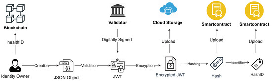In our proposed architecture, the owner can control their own identity. Figure 3 shows how the owner of healthID creates, stores, and manages the identity. The identity is a set of identity attributes describing the owner. We use a JSON (https://www.json.org/json-en.html (accessed on 1 May 2021)) object to define identity attributes, for instance, name, profile picture, license number, and public citizenship number, etc. The JSON attributes are digitally signed by a regulator to create a JSON Web Token (JWT). A JWT (https://jwt.io/ (accessed on 1 May 2021)), which is an open standard to securely transmitting information as a JSON object. The JWT identity token is an attested identity attribute of the owner. It can be used as proof that a particular regulator attests to the claim about the identity of a specific patient or healthcare provider. Attestation can also be a self-signed JSON token. The owner uploads the encrypted JWT identity attributes over a cloud service (Dropbox, IPFS). The hash of the identity attribute is used to ensure the integrity of the data. Each hash is identified by its hashID, which is a unique random number assigned to a particular hash. The hash and hashID are uploaded over the blockchain using the owner’s smart contract.