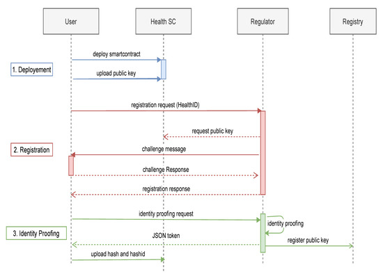 The overview of the remote healthcare IdM is illustrated in Figure 2. The patient, regulator, and provider use their applications to register to the blockchain. The application contains a secure inbuilt wallet having public and private key pairs. The application stores the private key in the secure enclave of the user device that can be utilized by biometric or password authentication. The private key is used to sign attestations and transactions sent to the blockchain. The public key is used to generate an account on the blockchain. The account is further used to deploy smart contracts over the blockchain. Each patient and healthcare provider deploys their smart contract. The healthID is the address of the smart contract deployed by each entity. The unique healthID is used for the identification and authentication process. Healthcare regulators register it by performing off-block identity proofing. The identity proofing of healthcare providers is conducted using their practice license, whereas patients can prove their identity using public identification such as passports, national identity cards, and driving licenses. For instance, the pharmaceutical council will be able to register the healthID of a pharmacist by verifying their practice license. In contrast, a public hospital will be able to register the healthID of a patient by verifying their public identity document. A consortium of healthcare regulators will manage the blockchain. Each member of the consortium will manage a node of the blockchain. When the blockchain is initialized, a specific predefined authority node would be used to validate new blocks on the network. New authority nodes can be included at any time based on the majority decision of existing authority nodes.