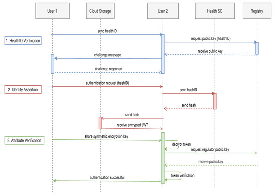 - Identity Assertion: In this step, identity assertion is used by the patient to authenticate the provider. The provider sends the hashID of the required identity token. The patient uses the hashID to receive the corresponding hash from the provider’s Health SC using the retrieve_hash function. This allows the blockchain to keep a record of each authentication taking place. The patient then uses the hash to retrieve the identity token (JWT) from cloud storage.