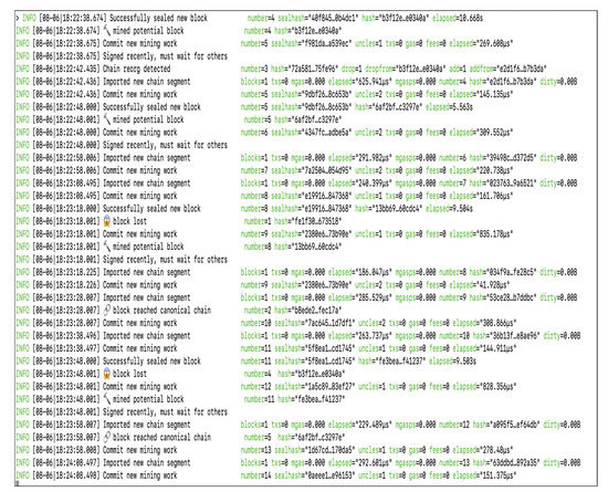 In order to compute the performance, we ran the blockchain for one hour for each setting. The information regarding each block is extracted from the geth console. The screenshot of the geth console is shown in Figure 6. The , NBL and BPT are directly extracted from the geth console.