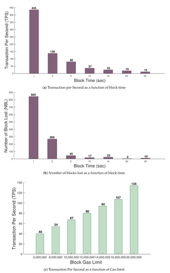In this subsection, we evaluate the effect of block-time and gas-limit on the performance of the blockchain. To determine the effect of these two parameters on blockchain performance, we compute TPS and NBL. As discussed earlier, TPS represents the number of transactions processed by the blockchain in a second, whereas NBL represents the number of blocks lost during block creation. Figure 7a shows TPS with respect to block-time. We can observe that TPS decreases rapidly when block-time is increased. To achieve a high TPS, a small value of block-time is required. However, we further observed that lower values of block-time have a high number of NBL, as shown in Figure 7b. The lost blocks introduce delay in the network as new blocks are required to replace them. A large decrease in NBL is observed for block-time between 1 to 5. This is because, at high block-time, sealers have additional time to validate the transactions. Therefore, we suggest a block-time between 5 and 10. For a block-time of 7, TPS of around 100 can be achieved with a low number of lost blocks. We further computed the effect of gas-limit on the TPS. From Figure 7c, we can observe the effect of gas-limit on the TPS. For a block-time of 7, we varied the gas-limit from 60,000,000 to 200,000,000. Currently, the public Ethereum blockchain [37] uses a gas-limit of 20,000,000. However, we can use higher gas-limits for a private blockchain as there are a limited number of nodes present in the network. To achieve higher TPS in a private blockchain, we can increase the gas-limit. This will allow a high number of transactions to be accommodated inside the block-time. For a gas-limit of 200,000,000, we observed that TPS reached above 130. We also experimented with the effect of gas-limit on NBL. However, we did not found any effect.