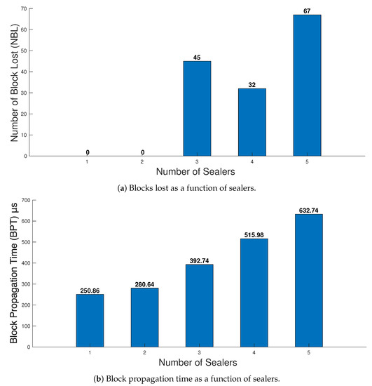 In this subsection, we observe the effect of sealers on blockchain performance. In the five-node network, we set the number of sealers from one to five and observed their effect on NBL and BPT. First, we tried to observe the NBL in one hour for sealers in the network, as shown in Figure 8a. It can be seen that there were no lost blocks until three sealers were selected. However, when more than three sealers were selected from five nodes, a high number of NBL were observed. The high number of NBL is caused due to synchronization between sealers. In order to validate the block as at least 51%, sealers need to verify it. Therefore if more nodes are made sealers, this may cause NBL to increase. Therefore the sealers should not be more than half the number of nodes present in the network. We further observed the BPT in the network concerning the number of sealers, as shown in Figure 8b. As discussed earlier, BPT is the time required for a block to be distributed to most nodes in the network. It can be observed from the Figure that the BPT is strongly dependent on the number of sealers. More synchronization issues were observed when the number of sealers was added to the network, which was the reason behind the higher propagation delay. As seen from the Figure, increasing the number of sealers to five, the BPT is increased by around . Therefore, to reduce the network minimum possible number, several sealers should be selected to run the network.