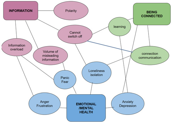 The data suggested that the participants were concerned about the impact of social media on their emotional and mental health. Four subthemes of emotional/mental health were identified in the coding process. The categories that were consistently identified by the participants as being associated with their mental health were: anxiety and depression, anger and frustration, panic and fear and/or isolation and loneliness. The foundations for these subthemes are described separately alongside the verbatim quotes. Some of the quotes illustrate more than one sub-theme simultaneously. See Figure 1 for interconnectedness between the subthemes in this theme. For example, if we look at information overload as a subtheme for information, this subtheme was very closely linked with anger, frustration and fear and panic that resulted in having an impact on emotional/mental health.