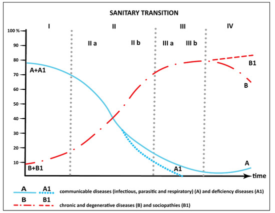 Omran (1998) added a new stage (alongside the three stages of the epidemiological transition developed in 1971), that of the emergence of new outbreaks of infectious diseases (AIDS, cholera, diphtheria, dengue fever) affecting mainly developing countries, but which should not be ignored by developed countries either [15]. Meslé and Vallin (2002) consider that after the 2000s we can speak of a transition from epidemiological transition to “sanitary transition” (Figure 1), by cause of improvements in public and private hygiene, nutrition and lifestyle, medical techniques, and health services [16,17,18,19]. The term “sanitary transition” was popularized and came into use after the Rockefeller Foundation used this phrase in sanitation programmes (eradication of worms and other types of parasites, hygiene training, construction of latrines, training of health workers in developing countries, etc.). These programmes were promoted because the term epidemiological transition seemed more complex, suggesting the idea of disease rather than health or hygiene [20].
