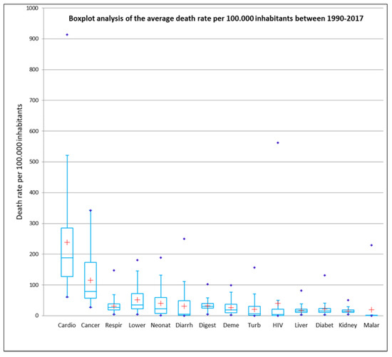 The boxplot representation (Figure 2) frames the most essential statistical features of a frequency distribution to have a better understanding and the possibility to perform a comparative analysis (Figure 3). The boxplot visualization is based on the synthesis of the five displays (“minimum”, first quartile (Q1), median, third quartile (Q3) and “maximum”), [34]. Boxplot analysis captures the intensity of deaths resulting from major diseases worldwide, the impact of diseases in the global hierarchy, but also the disparities between countries in the world on this issue, observable by comparing the large differences between the mean and median values for each variable.