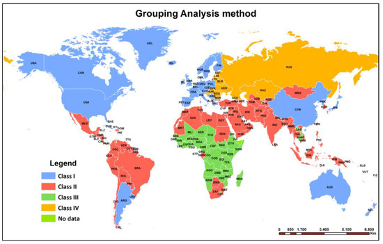 The grouping analysis method was carried out with the ArcMap software. 10.6, from ESRI (Environmental Systems Research Institute). One of the ArcMap tools software can identify a series of characteristics that show the existence of similarities within a group, in this case the similarities between the countries of the world in terms of the theme addressed in our study. The clustering results of this tool are based on the number of clusters specified, the analysis variables and optional spatial constraints. Performing several iterations serves to identify an optimal number of clusters as well as an appropriate combination of analysis variables [32].