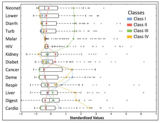 Class II has low values for deaths due to kidney disease, respiratory infections, deaths associated with diabetes and HIV-related conditions. Most countries in this class fell in Latin America, the Middle East and much of the Far East. In the case of Latin America, Frenk et al. formulated the “protracted polarised transition model”, a new conceptualisation designed to explain the process of epidemiological polarisation in these countries, characterised by an overlap of eras. They have experienced the re-emergence of malaria, dengue fever and other infectious diseases combined with the emergence of cancer and other endemic diseases against a background of increasing social and geographical inequalities [40,41]. North Africa and the Middle East have experienced a similar transition, social implications, links to the European continent and substantial public health measures have succeeded in reducing infectious diseases [42]. Class III generally groups countries with deaths due to quality of life conditions. Most of the countries in this group are located in sub-Saharan Africa plus two Asian countries (Cambodia and Laos). They have a number of indicators that point to serious problems in the national health system, exemplified by conditions such as neonatal diseases, diarrhoeal diseases, tuberculosis, malaria and HIV AIDS. Malaria affects mainly areas of East Africa, South and South-East Asia and even South America, and is an epidemic disease that also severely affects pregnant women, leading to premature births or intrauterine growth retardation [43,44]. In the case of AIDS, the territorial distribution is very uneven, with the most affected regions being Southern and Eastern Africa, with slight stagnation or some modest decline in the incidence of the disease being evidenced in Northern and Western Africa. AIDS in these regions also appears to be strongly influenced by migration, male circumcision, and herpes simplex virus infection. In the case of Cambodia and Laos, factors related to intravenous drug use and sex worker networks appear to have a direct influence on AIDS incidence [45,46]. A worrying public health problem in these countries is the association of AIDS, a disease that affects the immune system, with other infectious diseases (malaria, tuberculosis, etc.), leading to an increase in the number of deaths [47,48]. In recent years, however, both prevention and treatment programmes have proved effective, with infected people receiving modern medical services, appropriate treatment and counselling. In Africa morbidity and indirectly epidemiological transition has also been influenced by frequent wars or other forms of political violence. At the opposite pole are deaths caused by diseases specific to Western countries with high life expectancy: dementia, cardiovascular and respiratory diseases. In the countries of this category, health inequalities are also determined by a better understanding of life, more efficient health systems and more resources invested in the determinants of health (sanitation, healthy housing, access to education), with direct implications also in the increase in life expectancy, which still shows very large differences globally (84 years in Japan and Hong Kong compared to Sierra Leone or Central African Republic—52 years) [49]. Another study correlates increased life expectancy with the consumption of medicines, decreased alcohol consumption, tobacco consumption or increased consumption of fruit, vegetables [50].