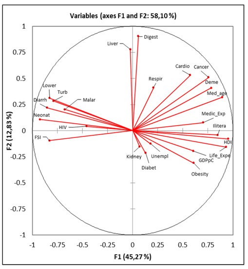 The advantage of using PCA is that it simplifies the data and makes it possible to synthetically interpret data on the distribution of the main forms of morbidity worldwide and how they are related. The resulting analysis clearly captures a clustering of variables according to a well-defined socio-economic profile. Variables in the F2 coordinate reflect the majority of diseases specific to developing countries, resulting from systemic problems, major economic and social deficiencies (Figure 7).