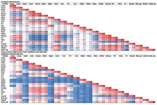 Negative correlations are present for deaths from conditions such as lower respiratory tract infections, neonatal conditions, diarrhoeal conditions, tuberculosis, HIV, and malaria. The situation is also confirmed by the socio-economic variables, the rate of deaths due to cardiovascular diseases shows a high degree of correlation with: life expectancy, median age of the population, human development index and literate population. At the opposite pole there is a negative correlation with the state fragility index (“The Organization for Economic Cooperation and Development (OECD) characterises fragility as the combination of exposure to risk and insufficient coping capacity of the state, systems and/or communities to manage, absorb or mitigate those risks. Fragility can lead to negative outcomes including violence, poverty, inequality, displacement, and environmental and political degradation”), which implies that deaths from cardiovascular disease are more specific to stable states [56]. Cancer deaths are highly correlated with the variable expressing dementia deaths. At the same time, this disease is more common in countries with a high standard of living, a situation reflected in the variables that capture quality of life: life expectancy, literacy, investment in the medical system, etc. Regardless of how the correlations of the analysis are interpreted, they are captured sufficiently clearly and validate the proposed hypotheses, as death rates from certain diseases have a pronounced regional specificity. Many of them show a pathological profile correlated with the standard of living and level of development of the countries analysed. The analysis also showed confirmation of Pearson correlations and by correlation coefficients R (Figure 8). In cases where there is a discrepancy in identifying links between variables, a detailed case study could be carried out.