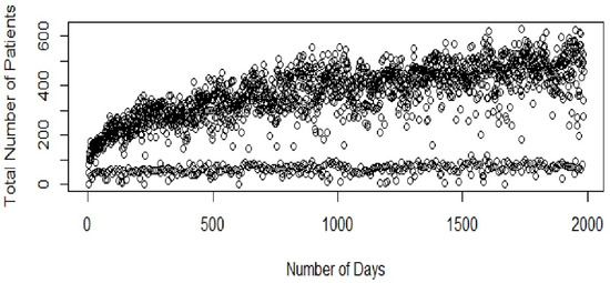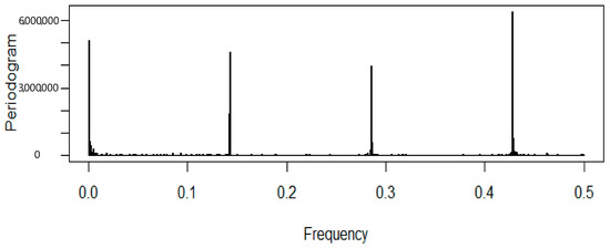The periodogram of the total number of patients suggests weekly seasonality (Figure 2). The periodogram shows spikes at frequencies of 0.14, 0.28, 0.42, etc., confirming seasonality with a time period of seven days.