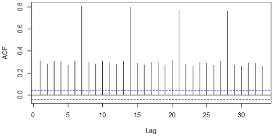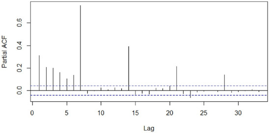Visualization tools such as the sample autocorrelation function (ACF) and sample partial autocorrelation functions (PACF) were used to examine stationarity of the series (Figure 3 and Figure 4). The Kwiatkowski–Philips–Schmidt– Shin (KPSS) test at the 0.05 significance level (α = 0.05) was used to understand the type of non-stationarity in the data and suggested the necessary transformations. From the KPSS test, it was observed that the series which is differenced with the lag of 7 was trend-stationary. The autocorrelation plot (Figure 3) showed spikes at lag 7 and its multiples and the partial autocorrelation plot (Figure 4) demonstrated an initial significant spike with a rapid decline at multiples of lag 7, both indicating a seasonal moving average term. Similar observations were in other categories as well; hence, similar procedures were followed to model other time-series data.