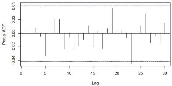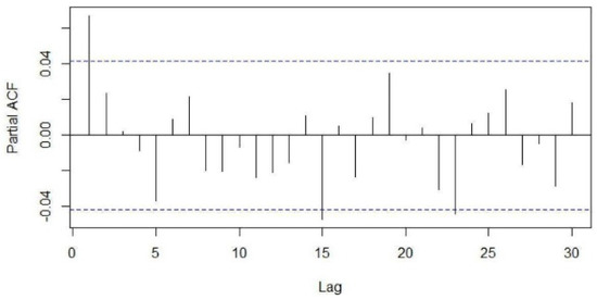 The type (seasonal or non-seasonal) and order (p, q, P, Q) of model parameters were identified on the basis of the ACF, PACF diagrams and Akaike information criterion (AIC) values. Different seasonal moving average (MA) models as suggested by the ACF and PACF plots were applied to our differenced data and the proximity of the model residuals to white noise was observed. The ACF and PACF of residuals of the ARIMA (0,0,0)(0,1,7)7 applied to the time-series data were closest to the white noise (Figure 5 and Figure 6). However, the ACF and PACF values observed at lag 1 suggested additional AR (autoregressive) or MA terms in our present model.