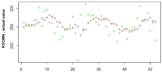 Comparison of actual (green) versus predicted (red) values.