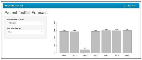 Figure 10 shows the prediction of the total patient footfall for the next seven days; an option to visualize a one-week-ahead forecast of variables such as the total count, male count, female count, pediatric count, adult count, delayed patient count and count of patients who are before the appointed time is given in the dropdown list. As a part of the ongoing validation of the model with the actual footfalls in the hospital, actual vs. predicted values of the previous seven days were showcased to assess the accuracy of the prediction. The forecasting model was integrated into the eyeSmart EMR system for the administrative staff.