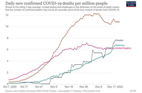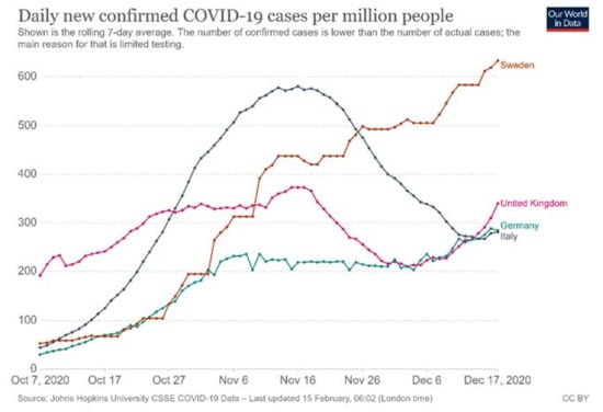 Within the EU, different countries were differently affected by the pandemic. Sweden, Italy, Germany, and the United Kingdom (UK) were all heavily affected; in total, they had 5,945,070 confirmed COVID-19 cases and 172,035 related deaths by 21 December 2020 (John Hopkins University, 21 December 2020). As we can see in Figure 1 and Figure 2, confirmed COVID-19 cases and COVID-19-related deaths do not correlate to each other in similar ways in these four countries, indicating that the pandemic has been managed differently at national level.