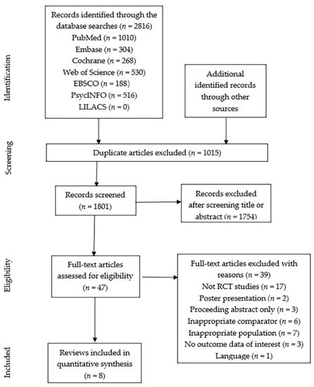 We initially retrieved 2816 articles through the electronic database searches, with 1801 remaining after removing 1015 duplicates. Based on inclusion criteria, 47 full-text articles were evaluated for eligibility. The meta-analysis ultimately included eight [14,16,17,18,19,20,21,22] of them (Figure 1). A total of 582 participants were enrolled in the included studies. The characteristics of these eight studies are illustrated in Table 2. Six studies were conducted in China [14,16,17,18,19,22], and one each in Japan [20] and Iran [21]. All the included studies reported the LVEF, three for LVEDD [17,19,21], two for LVESD [19,21] and two for LVEDV and LVESV [14,21].