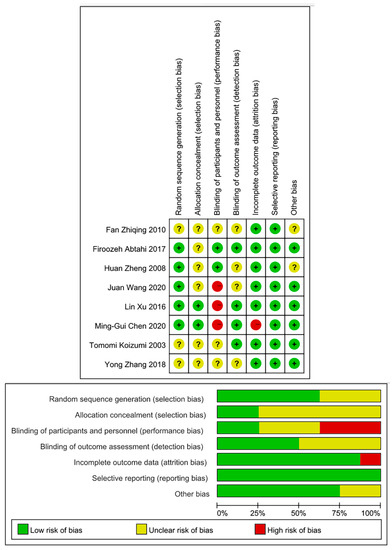 The assessment of the risk of bias for all included studies was summarized and shown as Figure 2. The overall risk of bias was low or unclear. All studies presented balance in baseline characteristics. Almost all the studies reported that the study was ‘randomized’ while three trials did not provide the details of the generation of the random sequence [16,20,22]. Only two studies reported appropriate concealment of allocation, other studies [16,17,19,20,21,22] were rated unclear due to lack of sufficient details. In the aspect of blinding, it is impractical to blind participants and program personnel on the basis of exercise-based CR. Four articles [14,18,20,21] reported adequate description of the blinding of the outcome assessment. For attrition bias, only one study [18] was judged as “high risk of bias” due to 14.6% rate of loss of follow-up. The risk for reporting bias was low for all included studies. Two articles [19,22] were rated “uncertain risk of bias” for other bias because of a lack of sufficient information.