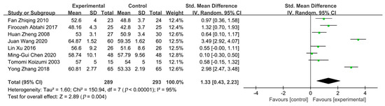 Statistical analysis was conducted using the Review Manager 5.4 (The Nordic Cochrane Centre, The Cochrane Collaboration, Copenhagen, Denmark, 2020). The outcomes of intervention effect were evaluated by echocardiograph at baseline and after intervention. The mean differences and 95% confidence intervals (CI) were used to represent the intervention effect. Statistical heterogeneity was quantified by the chi-square test and the I2 statistic. Given p ≤ 0.10, I2 ≥ 50%, we adopted the random-effects model would be adopted; otherwise, a fixed-effects model would be applied. The results were presented as the standardized mean difference (SMD) with 95% CI and p value, p < 0.05 was considered to be statistically significant. Publication bias was assessed by funnel plot.