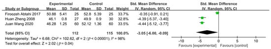 Three of the studies [17,19,21] focused on the effect of exercise-based CR on LVEDD of patients with AMI after PCI. The result showed that exercise-based CR had a significant effect in reducing LVEDD compared with the control group (std. mean difference = −3.05; 95% CI: −6.00 to −0.09; p = 0.04). Based on the high level of heterogeneity (p < 0.0001, I-squared = 98%) we used a random-effects model to analyze data (Figure 4).