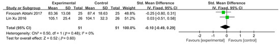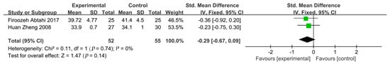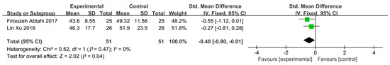 Additionally, two studies [14,21] showed that exercise-based CR has a positive effect in reducing LVESV. Figure 5 showed that there was a more significant decrease in LVESV in the experimental group than in the control group (std. mean difference = −0.40; 95% CI: −0.80 to −0.01; p = 0.04). The heterogeneity has no significant difference (p = 0.047, I-squared = 0%).