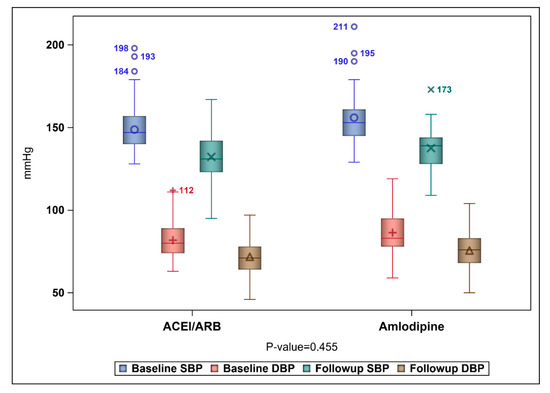 represent the means of the baseline SBP, baseline DBP, follow-up SBP, and follow-up DBP, respectively. The outside written values are outliers.